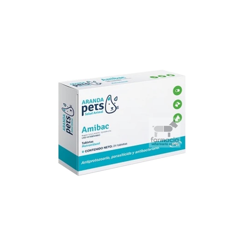 AMIBAC CAJA CON 24 TABLETAS Antiprotozoario, parasiticida y antibacteriano.  USO VETERINARIO Descripción: Amibac es un fármaco eficaz en el tratamiento de Entamoeba histolytica, Giardia spp, Trichomonas y Balantidium coli, en caninos, además de ser coadyuvante en el tratamiento de infecciones entéricas y sistémicas causadas pos organismos anaerobios.  Fórmula:  Cada tableta contiene: Metronidazol ................................ 500 mg Excipiente c.b.p. .......................... 1 tableta Dosis: Caninos: 1 tableta por cada 25 kg de peso corporal, durante 5 - 7 días. A criterio del Médico Veterinario