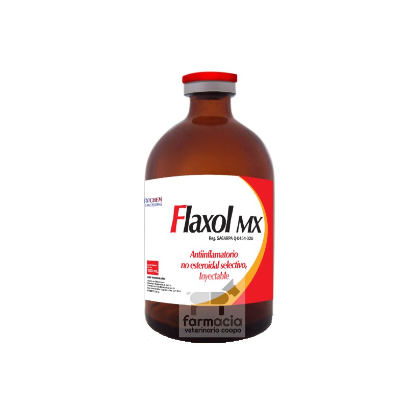 FLAXOL MX 20 mL Antiinflamatorio inyectable USO VETERINARIO Fórmula: Meloxicam ................. 2.0 mgVehículo c.b.p............  1 mL Presentación: Frasco de 20 mL Descripción: Antiinflamatorio no esteroide en solución inyectable para caninos. Antiinflamatorio, analgésico y antipirético para caninos. El Meloxicam es un antiinflamatorio no esteroide (AINE) pertenenciente al grupo de los ácidos enólicos. Es un potente inhibidor de la síntesis de prostaglandinas cuya acción es derivada de la inhibición selectiva de la enzima ciclooxigenasa (COX2). RESTRICCIONES DE USONo administrar a animales menores a 6 meses ni a hembras en gestación o lactando dado que sus efectos en estas categorías no han sido evaluados. Antiinflamatorio no esteroidal del tipo selectivo a COX-2, útil para el tratamiento de los procesos inflamatorios de las vías respiratorias, otitis y traumatismos. También es efectivo en el tratamiento de la artritis, distensiones musculares y en infecciones que cursen con inflamación, dolor o fiebre. Dosis: Bovinos: 0.5 mg/Kg de peso (equivalente a 2.5 ml/100 Kg de peso) cada 12 o 24 horas según sea el caso.Porcinos: 0.4 mg/Kg de peso (equivalente a 1 ml/50 Kg de peso).Caninos: 0.10.2 mg/Kg de peso (equivalente a 0.125 0.25 ml/25 Kg de peso) cada 24 horas.La dosis y duración del tratamiento varían a criterio del médico veterinario. Uso en:  Caninos y Felinos. Vía de administración:  Subcutánea. Advertencias: No administrar a animales menores a 6 meses ni a hembras en gestación o lactando dado que sus efectos en estas categorías no han sido evaluados. No tratar animales con problemas hepáticos. Puede ocasionar irritación gástrica. Protéjase de la luz y manténgase en un lugar seco. No se deje al alcance de los niños. Producto de uso exclusivo en Medicina Veterinaria. Su venta requiere receta médica.