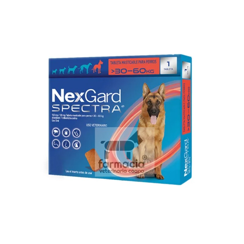 Ofrecer las tabletas masticables intactas de acuerdo al peso de su perro en intervalos mensuales. NexGard Spectra (Afoxolaner 150 mg/ milbemicina oxima 30 mg) es una tableta masticable blanda y altamente palatable que es consumida por los perros al ser ofrecida directamente. En forma alternativa, NexGard Spectra puede ser ofrecido intacto con una pequeña porción de comida. Para un tratamiento óptimo, administre mensualmente el mismo día de cada mes o un día cercano a este.