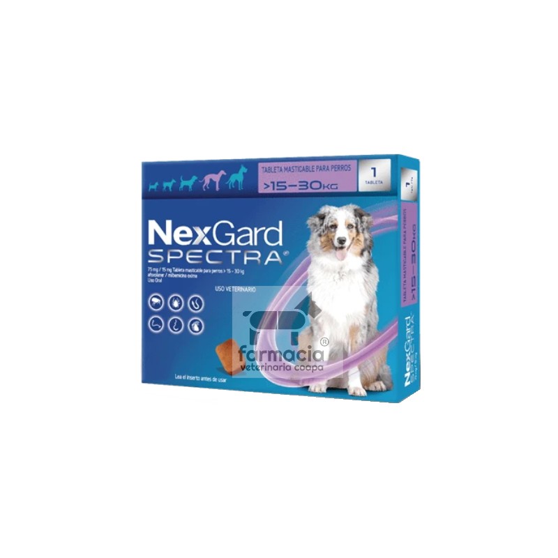 Ofrecer las tabletas masticables intactas de acuerdo al peso de su perro en intervalos mensuales. NexGard Spectra (Afoxolaner 150 mg/ milbemicina oxima 30 mg) es una tableta masticable blanda y altamente palatable que es consumida por los perros al ser ofrecida directamente. En forma alternativa, NexGard Spectra puede ser ofrecido intacto con una pequeña porción de comida. Para un tratamiento óptimo, administre mensualmente el mismo día de cada mes o un día cercano a este.
