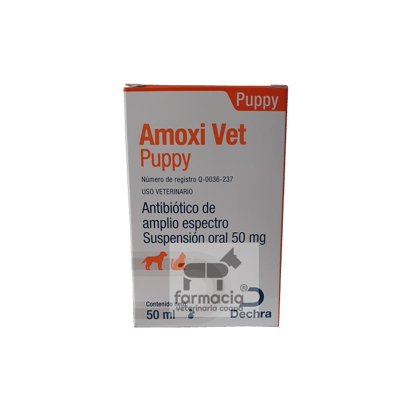 AMOXI VET PUPPY SUSPENSIÓN ORAL 50 ml Antiobiótico de amplio espectro. USO VETERINARIO Presentación: Frasco suspensión de 50 ml Fórmula: Cada ml contiene:Amoxicilina trihidratada ... 50 mgVehículo c.b.p. .............. 1 ml Indicaciones: Antibiótico de amplio espectro para el tratamiento de infecciones causadas por gérmenes sensibles a la amoxicilina localizadas en tracto digestivo, tracto urogenital, vías respiratorias superiores e inferiores nasofaringe, piel, tejidos blandos y para la profilaxis durante procedimientos odontológicos, así como complicaciones bacterianas.Uso en: Caninos y felinos Dosis: 1 ml/5 kg PC. Cada 8 -12 horas.A criterio del Médico Veterinario. Vía de Administración: Oral. Advertencias:  Ajustar las dosis en animales con alteraciones renales. Agítese antes de usar.