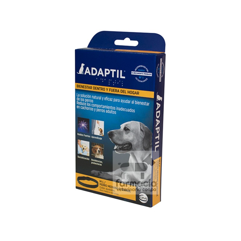 Descripción:El collar ADAPTIL ayuda a tu perro a sentirse bien de manera constante. Cuando una hembra tiene una camada, segrega unas feromonas naturales que relajan a los cachorros, estas son imperceptibles para los humanos y otros animales, pero no para las crías que, gracias a ellas, reciben un mensaje de tranquilidad y seguridad. Por ello, el collar ADAPTIL es la mejor solución cuando la causa del estrés está fuera de casa, pues le ayuda a sentirse bien y a calmarse en aquellas situaciones que le producen miedo. El efecto tranquilizador del collar ADAPTIL está científicamente demostrado. Ayuda con los comportamientos derivados del estrés y miedo por ruidos fuertes como fuegos artificiales o tormentas, estancia en pensiones, cursos de entrenamiento, entre otros.