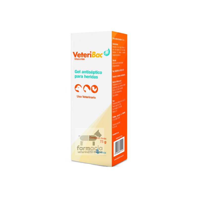 Lavar muy bien la herida con agua y jabón. Después de secar, aplicar en forma directa VeteriBac® Mascotas sobre la zona afectada hasta cubrir la herida.