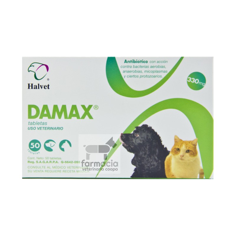 Tabletas están indicadas para el tratamiento de enfermedades infecciosas causadas por bacterias como Staphylococcus aureus, S. intermedius, Streptococcus spp, Clostridium perfringens, Propionibacterium spp, actinomyces spp, bacteroides melaninogenicus, Bacteroides fragilis y Fusobacterium necrophorus responsables de enfermedades como infecciones de la piel y tejidos blandos, pododermatitis, artritis, osteomielitis, enfermedad periodontal, abscesos, piómetra, bronconeumonía en toxoplasmosis, heridas infectadas, gingivitis, estomatitis, prostatitis, enteritis bacterianas y sepsis.Por su espectro antiprotozoario DAMAX y DAMAX 11 se pueden usar en el tratamiento de toxoplasmosis, neosporosis y babesiosis.Vía de administración:Oral