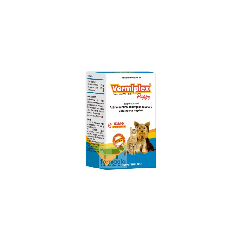 VERMIPLEX PUPPY SUSPENSIÓN ORAL 40 mL Antihelmíntico de amplio espectro para perros, gatos y cachorros USO VETERINARIO Fórmula: Cada ml contiene: Pamoato de pirantel 15 mg Pamoato de oxantel 15 mg Vehículo, c.b.p. 1 ml. Presentación: Frasco suspensión 40 ml Indicaciones:  Antihelmíntico de amplio espectro para el tratamiento de parasitosis internas en perros adultos y gatos causadas por: Toxocara canis, Toxocara cati, Toxascaris leonina, Ancylostoma spp, Uncinaria spp y Trichuris spp. Dosis: 1 ml de VERMIPLEX PUPPY SUSPENSIÓN por cada kg de peso. El tratamiento puede administrarse a partir de las 2 semanas de edad, repitiendo la dosis cada 15 días hasta los 3 meses de edad. En casos de infestaciones severas se sugiere repetir la dosis durante 3 días consecutivos. Puede administrarse a hembras gestantes o en lactación. Vía de administración:  Oral. Advertencias:  No se administre conjuntamente con morantel, levamisol o piperazina. No se administre en animales enfermos o débiles. Consulte al Médico Veterinario
