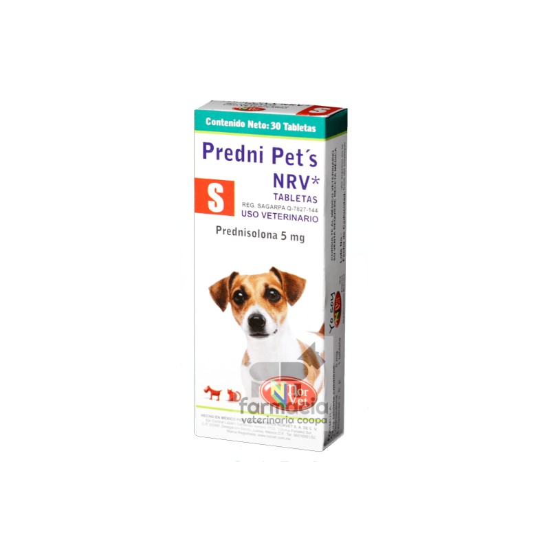 PREDNI PETS NRV  S 30 TABLETAS Antiinflamatorio e Inmunosupresor USO VETERINARIO Fórmula: Cada tableta contiene: Prednisolona 5 mg Excipiente c. b. p. 1 tableta Indicaciones: PREDNI PET´S NRV* TABLETAS es un corticosteroide que se usa como antiinflamatorio e inmunosupresor. Se recomienda para el tratamiento de: psoriasis, dermatitis seborreica grave, rinitis alérgica estacional, dermatitis atópica y por contacto, sinovitis, osteoartritis y tenosinovitis, bursitis, tendocitis entre otras inflamaciones músculo esqueléticas agudas. Así como en procesos inflamatorios o alergias graves del ojo como conjuntivitis alérgica, uveítis, queratitis entre otras que afectan a los perros y gatos. Dosis: 1 mg por kg de peso corporal equivalente a 1 tableta por cada 5 kg de peso corporal cada 12 h Se recomienda disminuir la dosis gradualmente hasta interrumpir el tratamiento. A criterio del Médico Veterinario. Vía de administración: Oral. Advertencias: No usar en enfermedades virales. No utilizar este producto en el Síndrome de Cushing. No usar en tuberculosis. Esta contraindicado en caso de úlcera o sangrado en el tracto gastrointestinal y úlcera corneal. No utilizar este producto asociado con otros desinflamatorios, diuréticos o anticoagulantes. No utilizar este producto si existe nefritis crónica. No usar en hembras gestantes. Mantenga este producto en un lugar fresco, seco y protegido de la luz. No se deje al alcance de los niños y animales domésticos. Consulte al Médico Veterinario. Para uso exclusivamente Veterinario.