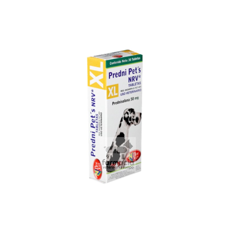 PREDNI PETS NRV XL 30 TABLETAS Antiinflamatorio e Inmunosupresor USO VETERINARIO Fórmula: Cada tableta contiene: Prednisolona 50 mg Excipiente c. b. p. 1 tableta Indicaciones: PREDNI PET´S NRV* TABLETAS XL es un corticosteroide que se usa como antinflamatorio e inmunosupresor. Se recomienda para el tratamiento de psoriasis, dermatitis seborreica grave, rinitis alérgica estacional, dermatitis atópica y por contacto, sinovitis, osteoartritis y tenosinovitis, bursitis, tendocitis entre otras inflamaciones músculo esqueléticas agudas. Así como en procesos inflamatorios o alergias graves del ojo como conjuntivitis alérgica, uveítis, queratitis entre otras que afectan a los perros y gatos. Dosis: 1 mg por kg de peso corporal equivalente a 1 tableta por cada 50 kg de peso corporal cada 12 h Se recomienda disminuir la dosis gradualmente hasta interrumpir el tratamiento. A criterio y responsabilidad del Médico Veterinario Vía de administración: Oral. Advertencias: No usar en enfermedades virales. No utilizar este producto en Síndrome de Cushing. No usar en tuberculosis. Esta contraindicado en caso de úlcera o sangrado en tracto gastrointestinal y úlcera corneal. No utilizar este producto asociado con otros desinflamatorios, diuréticos o anticoagulantes. No utilizar este producto si existe nefritis crónica. No usar en hembras gestantes. Mantenga este producto en un lugar fresco, seco y protegido de la luz. No se deje al alcance de los niños y animales domésticos. Consulte al Médico Veterinario. Para uso exclusivamente Veterinario.