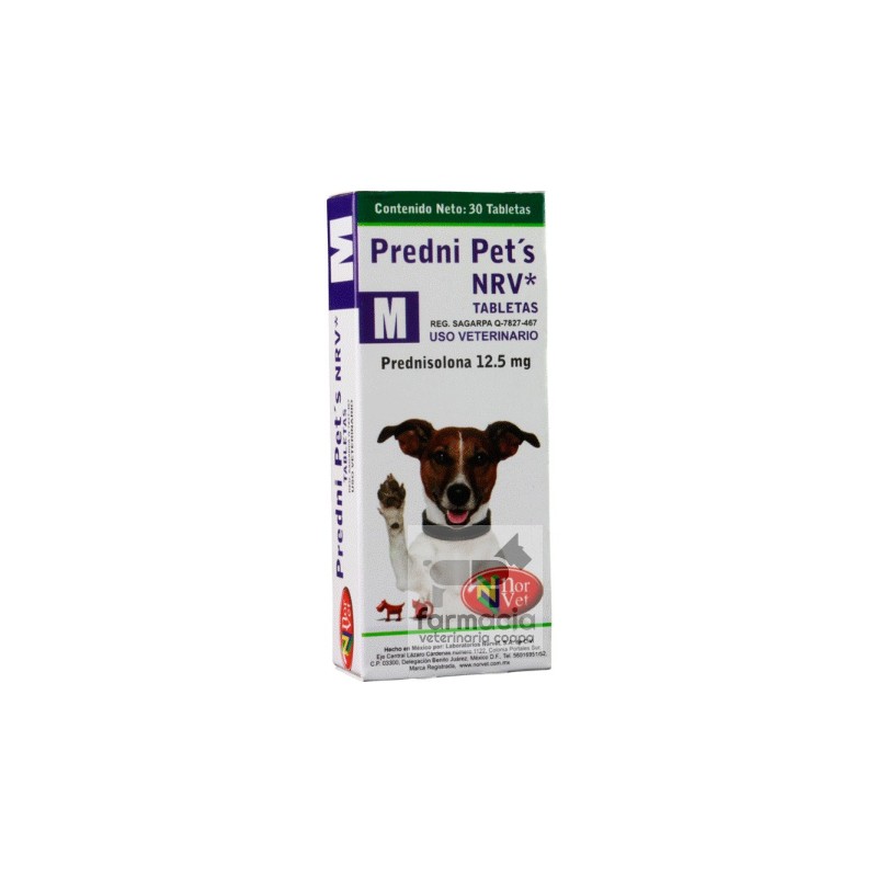 PREDNI PETS NRV  M 30 TABLETAS Antiinflamatorio e Inmunosupresor USO VETERINARIO Fórmula: Cada tableta contiene: Prednisolona 12.5 mg Excipiente c. b. p. 1 tableta Indicaciones: PREDNI PET´S NRV* TABLETAS M es un corticosteroide que se usa como antiinflamatorio e inmunosupresor. Se recomienda para el tratamiento de psoriasis, dermatitis seborreica grave, rinitis alérgica estacional, dermatitis atópica y por contacto, sinovitis, osteoartritis y tenosinovitis, bursitis, tendocitis entre otras inflamaciones músculo esqueléticas agudas. Así como en procesos inflamatorios o alergias graves del ojo como conjuntivitis alérgica, uveitis, queratitis entre otras que afectan a los perros y gatos. Dosis: 1 mg por kg de peso corporal equivalente a 1 tableta por cada 12.5 kg de peso corporal cada 12 h Se recomienda disminuir la dosis gradualmente hasta interrumpir el tratamiento. A criterio y responsabilidad del Médico Veterinario. Vía de administración: Oral. Advertencias: No usar en enfermedades virales. No utilizar este producto en Síndrome de Cushing. No usar en tuberculosis. Esta contraindicado en caso de úlcera o sangrado en tracto gastrointestinal y úlcera corneal. No utilizar este producto asociado con otros desinflamatorios, diuréticos o anticoagulantes. No utilizar este producto si existe nefritis crónica. No usar en hembras gestantes. Mantenga este producto en un lugar fresco, seco y protegido de la luz. No se deje al alcance de los niños y animales domésticos. Consulte al Médico Veterinario. Para uso exclusivamente Veterinario.