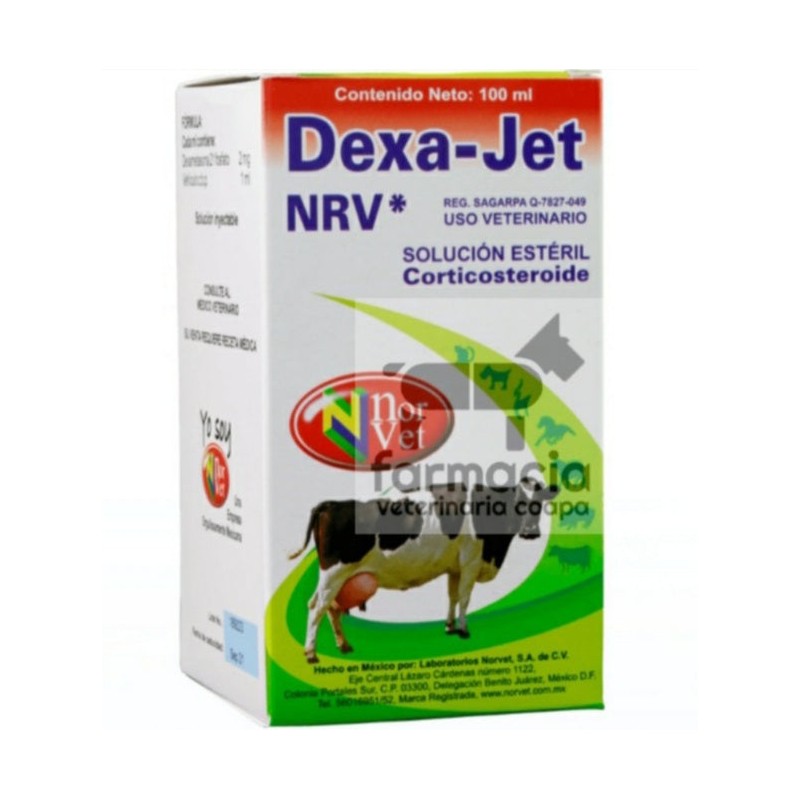 DEXA-JET NRV* es un Corticosteroide Antiinflamatorio y con actividad Glucogénica y Antialérgica, recomendado en casos de Artritis, Tenosinovitis, Bursitis, Rinitis, Dermatitis, Otitis, Paresia Postparto y en Intoxicaciones Alimenticias de los Bovinos, Equinos, Porcinos, Ovinos, Caprinos, Caninos y Felinos.