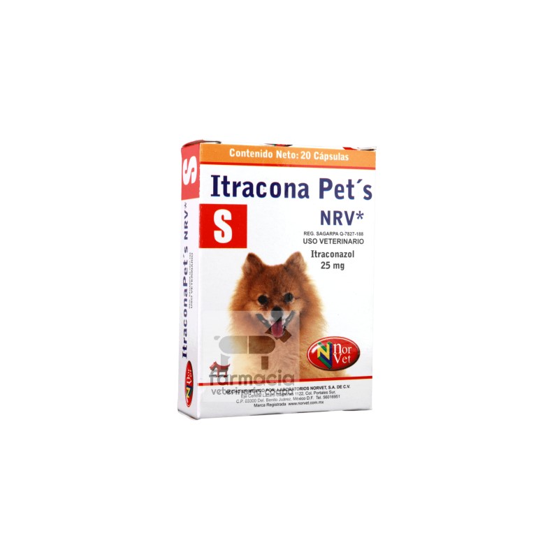 ITRACONA PETS S NRV  Antimicótico USO VETERINARIO Fórmula: Cada cápsula contiene: Itraconazol 25 mg Excipiente c.b.p. 1 cápsula Indicaciones: ITRACONA PET’S está indicado en el tratamiento de Micosis Sistémicas incluyendo Aspergilosis, Meningitis por Criptocococis, Blastomicosis e Histoplasmosis. Se recomienda su uso en Candidiasis Cutánea o Dermatofitosis, Onicomicosis, Pitiriasis Versicolor, Queratitis Micótica y Candidiasis oral. Dosis: Caninos y Felinos: 5 mg por kg de peso (equivalente a 1 cápsula por cada 5 kg de peso), cada 12 a 24 h La dosificación y duración del tratamiento es responsabilidad y criterio del Médico Veterinario. Vía de administración: Oral. Advertencias: No usar en hembras gestantes. Los antiácidos como Ranitidina y Cimetidina, disminuyen la absorción del Itraconaz