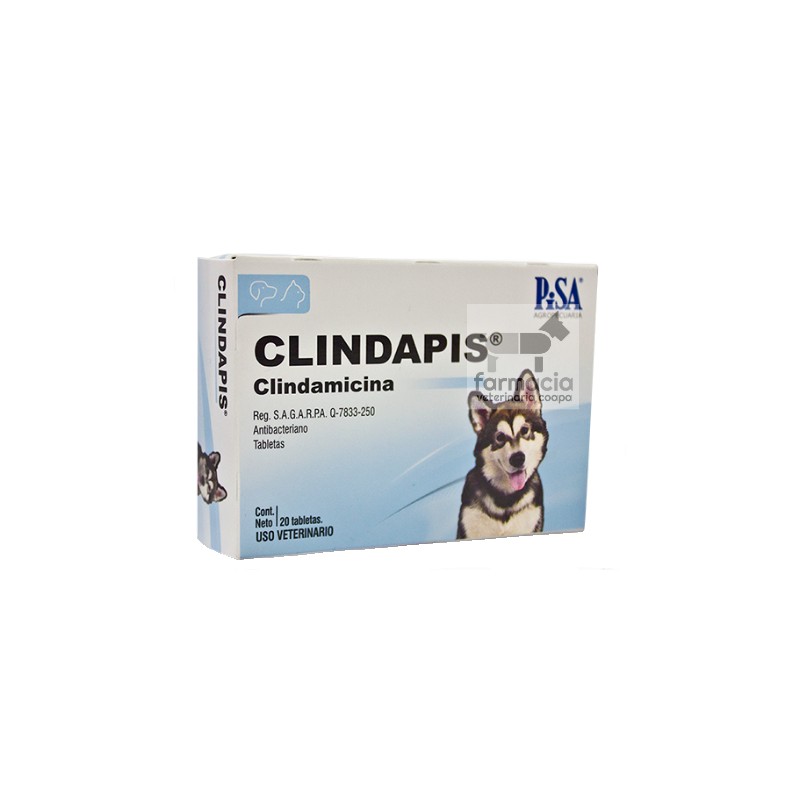 CLINDAPIS TABLETAS Antibiótico USO VETERINARIO Fórmula: Cada tableta contiene: Clorhidrato de Clindamicina 150 mg Excipiente cbp Una tableta Presentación: Caja con 20 tabletas. Descripción: Antibiótico de amplio espectro para perros y gatos con acción sobre bacterias Gram positivas y Gram negativas, aerobios y anaerobios. Dosis: Perros: Dosis media: 5.5 mg/kg cada 12 horas o 11 mg/kg de cada 24 horas. Continuar 48 horas después de la desaparición de los signos clínicos. Tabletas; (1 tableta para tratar perros de entre 13 – 27 kg.) Solución; (De 0.22 a 0.44 mL por kg). Osteomielitis: 11 mg de clindamicina/kg cada 12 horas durante cuatro semanas. Neosporosis: 11 mg/kg cada 12 horas por un periodo de cuatro semanas. Preferentemente no extender el tratamiento por más de 30 días, en forma continua. Para pioderma por estafilococos: 11 mg/kg cada 24 horas por 7 a 28 días. Tabletas; (1 tableta para tratar perros de 13 kg.) Solución; (0.22 mL por kg). Para heridas infectadas, abscesos e infecciones dentales administrar: 5.5-33 mg/kg cada 12 horas, por 7 a 28 días. Tabletas; (1 tableta para tratar perros de entre 4.5 – 27 kg.) Solución; (De 0.22 a 1.3 mL por kg). Gatos: Dosis media: 5.5 mg/kg cada 12 horas o 11 mg/kg de cada 24 horas. Continuar 48 horas después de la desaparición de los signos clínicos. Solución; (De 0.22 a 0.44 mL por kg). Toxoplasmosis: 10-20 mg/kg cada 12 horas, durante 2 semanas. Solución; (De 0.4 a 0.8 mL por kg). Heridas infectadas, abscesos e infecciones dentales: De 11-33 mg/kg cada 24 horas, por un máximo de 14 días. Solución; (De 0.44 a 1.3 mL por kg). En infecciones agudas, si no se observa respuesta a la terapia en tres o cuatro días debe suspender el tratamiento en ambas especies. La dosis puede incrementarse hasta 30 mg/kg al día a criterio del Médico Veterinario y de acuerdo al padecimiento tratado. Precauciones especiales: Pacientes con enfermedad renal y/o hepática severa, deben recibir el medicamento con extrema precaución. Se recomienda realizar constantes monitoreos sanguíneos, y manejar dosis reducidas. Se recomienda que su uso se base en pruebas de sensibilidad. El uso del medicamento en condiciones distintas a las recomendadas puede incrementar la prevalencia de bacterias resistentes a la clindamicina. Vía de administración: Oral. Advertencias: Producto de uso exclusivo en medicina veterinaria, no se use en humanos.  Consérvese a temperatura ambiente a no más de 30°C, lejos de la humedad y del calor.  No se deje al alcance de los niños.