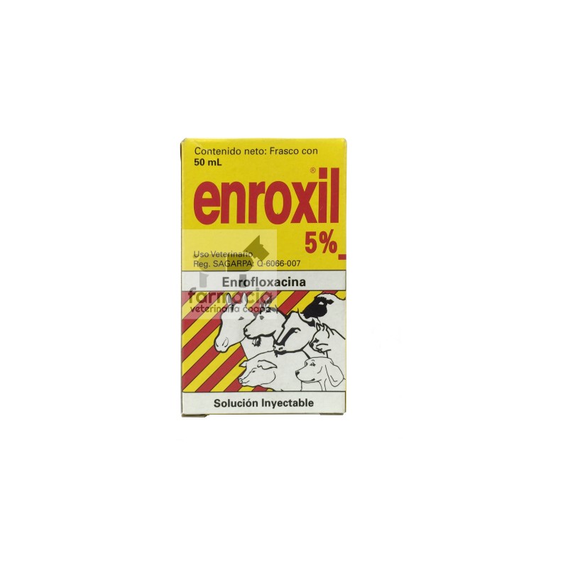 ENROXIL 5% INYECTABLE 50 ML. Antibiótico. USO VETERINARIO Fórmula: Cada mL de solución inyectable al 5% contiene: 50 mg de Enrofloxacina. Vehículo c.b.p. 1 mL Descripción: Potente antimicrobiano de amplio espectro y micoplasmicida. Uso indicado en: Bovinos, porcinos, caprinos, ovinos y pequeñas especies Dosis: 1 mL/20 kg de peso corporal, cada 24 horas. Duración del tratamiento: 3 a 5 días Contraindicaciones: Enroxil Solución inyectable no deben administrarse volúmenes mayores a 10 mL en un mismo sitio de aplicación.
