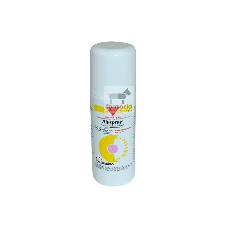 Propiedades:Aluspray® se aplica localmente en forma de aerosol. Esta modalidad de administración permite al polvo de aluminio cubrir por completo todas las irregularidades de las heridas. El aluminio no penetra en las células y permanece a nivel de las membranas, por lo que, las células reducen su permeabilidad pero permanecen viables.Gracias a sus propiedades astringentes el aluminio posee una acción bactericida. Esta misma particularidad favorece la precipitación de proteínas que forma una capa protectora sobre el área infectada lo que ayuda a reparar el tejido.El aluminio está directamente involucrado como catalizador en la biosíntesis de colágeno la cual ocurre durante la reparación tisular al sanar heridas. De ahí que, además de actuar como protector, lo haga como cicatrizante.El polvo de aluminio solo es eficaz en lesiones lavadas y desinfectadas.