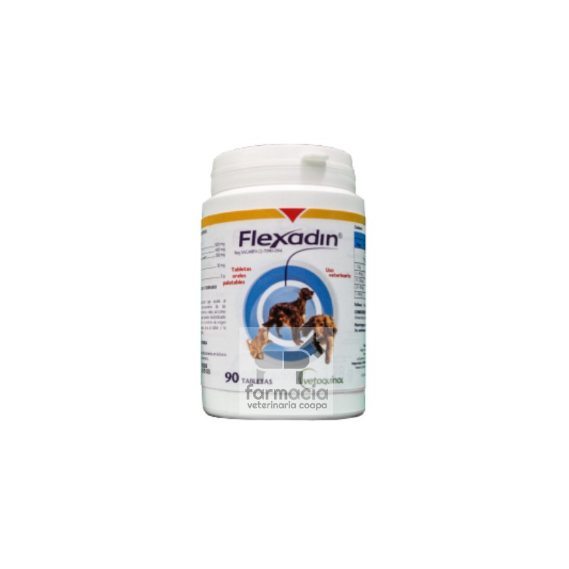 FLEXADIN 90 TABLETAS Suplemento nutricional a base de condroitin, glucosamina, manganeso y Harpagophytum procumbens para caninos y felinos domésticos USO VETERINARIO Fórmula: Glucosamina 500 mg Condroitin sulfato 400 mg Harpagophytum procumbens 150 mg Manganeso 10 mg Saborizante a pollo, c.b.p. 1 comprimido de 2 g. Presentación:   90 comprimidos. Descripción:  La integridad del cartílago articular es un elemento fundamental para mantener las capacidades locomotoras y calidad de vida del paciente, particularmente en perros de edad avanzada, de raza grande y gigante o que padecen obesidad. En el canino doméstico, las articulaciones más afectadas son la coxofemoral, femorotibiopatelar y en menos grado la escapulohumeral. Por su fórmula original con condroitin,