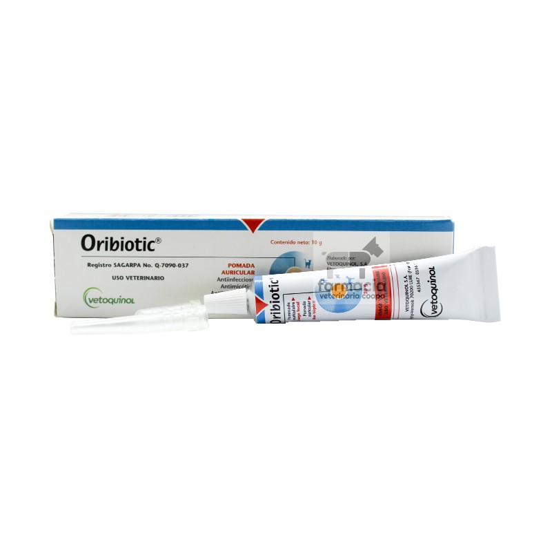 ORIBIOTIC POMADA AURICULAR 10 GR Oribiotic es una pomada auricular con actividad antibiótica, antimicótica y antiinflamatoria indicada para el tratamiento de otitis externas mixtas de origen bacteriano o micótico. USO VETERINARIO Uso en: perros y gatos Ingredientes: Neomicina, Nistatina y Triamcinolona. Instrucciones de uso: La administración es vía ótica o auricular. Después de limpiar el conducto auditivo, introduciendo la cánula flexible se aplica la pomada y se da un suave masaje en la base de la oreja para distribuirlo perfectamente. Se aplica una porción de la pomada 2 o 3 veces por día durante 1 o 2 semanas.