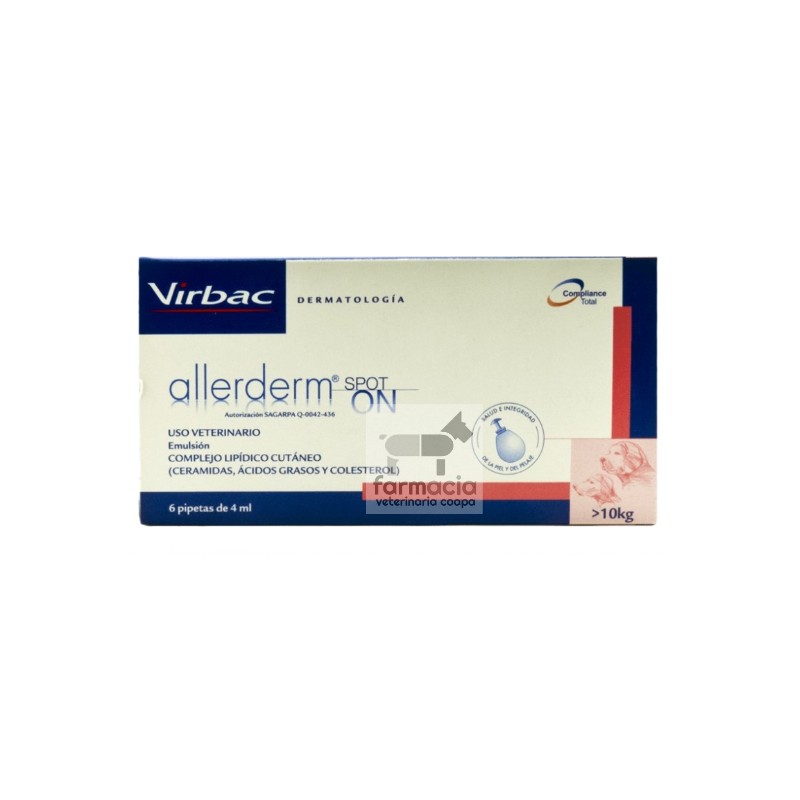 ALLERDERM SPOT ON PERROS MEDIANOS Y GRANDES Reparador dérmico de fácil aplicación USO VETERINARIO    Fórmula: Complejo Lipídico Cutáneo: ceramidas 3, ceramidas 6 II, ceramidas 1, ácidos grasos y colesterol.Lauril lactato sódico. Goma xantana. Agua Propiedades:ALLERDERM Spot-On contiene una combinación de ceramidas, ácidos grasos y colesterol (Complejo Lipídico Cutáneo) similar a la que se encuentra en la piel de perros y gatos sanos.ALLERDERM Spot-On es un producto tópico especialmente adecuado para animales con problemas de piel. Está altamente recomendado como complemento al tratamiento de dermatosis en perros y gatos gracias a una combinación de ingredientes que ayudan a restablecer la integridad cutánea.Instrucciones de Uso: Para abrir la pipeta, manténgala hacia arriba y gire el tapón firmemente hasta que se rompa.En gatos: Aparte el pelo de la zona del cuello hasta que la piel quede a la vista. Coloque la punta directamente sobre la piel y presione suavemente la pipeta hasta que su contenido se haya vaciado completamente sobre la piel.En perros: Aparte el pelo de la zona entre los omóplatos hasta que la piel quede a la vista. Coloque la punta directamente sobre la piel y presione suavemente la pipeta hasta que su contenido se haya vaciado completamente sobre la piel. Vacíe todo el contenido de la pipeta a lo largo de la espalda del perro.ALLERDERM Spot-On puede aplicarse directamente sobre piel lesionada.Dosis y modo de uso: Utilice las pipetas de 2 ml para gatos y/o perros de menos de 10 kg. Para perros de 10 kg o más, utilice la pipeta de 4 ml.*Aplique una pipeta a la semana durante 4 semanas. La dosis puede aumentarse (de dos a tres pipetas a la semana, hasta una al día) dependiendo de la gravedad de las lesiones y según el consejo de su veterinario.*Para limitar las recaídas y mantener la piel y el pelaje sanos, aplique una pipeta al mes como tratamiento de mantenimiento.*Para unos mejores resultados, aplique después del baño cuando el pelo esté completamente seco. Evite el almacenamiento prolongado a temperaturas por encima de 25ºC