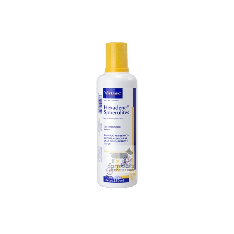 HEXADENE SPHERULITES SHAMPOO Shampoo antiséptico y contra levaduras de la piel en perros y gatos USO VETERINARIO Fórmula: Cada 100 ml contienen: Clorhexidina (gluconato) 20%             3.0 g Microcápsulas                                    2.7 g Vehículo c.b.p.                                100 ml Descripción: Para su uso en perros y gatos. El amplio espectro de la clorhexidina y su baja toxicidad hacen de Hexadene® Spherulites un antiséptico de elección para la curación de heridas en la piel*, lavado pre-quirúrgico*, piodermias, como adyuvante en infecciones por Melassezia pachydermatis y hongos. Dosis: Se recomienda aplicar de 2 o 3 veces por semana, dependiendo de la condición clínica del paciente, hasta la mejora de los signos (2-4 semanas). Posteriormente úselo una vez por semana. A recomendación del Médico Veterinario. *Para lavado de heridas o lavado pre-quirúrgico, úselo en una dilución con una parte de Hexadene® Spherulites por 16 partes de agua. Modo de uso:  Agite el producto antes de usar. Aplique Hexadene® Spherulites sobre el pelaje previamente mojado, dando masaje vigoroso en todo el cuerpo del animal hasta formar abundante espuma. Espere de 10 a 15 minutos antes de enjuagar perfectamente. Repita todo el procedimiento. Vía de administración: Tópica cutánea. Advertencias: ??Manténgase fuera del alcance de los niños y animales domésticos. Para aplicación externa solamente. En caso de contacto con los ojos o con las mucosas, enjuague abundantemente con agua. Mantenga el producto en un lugar fresco y seco, protegido de la luz solar directa.